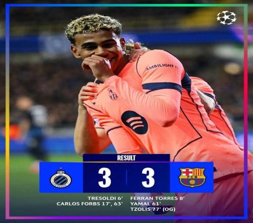 巴萨三度落后三度追平,上半场特雷索尔迪率先进球,费兰-托雷斯迅速扳平,博尔赫斯破门主队半场2-1领先。下半场费尔明助攻亚马尔扳平,博尔赫斯梅开二度,亚马尔造佐利斯乌龙,两队3-3握手言和。