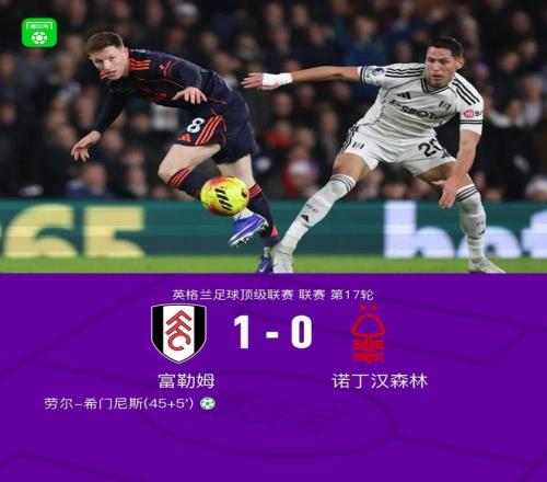 北京时间12月23日,英格兰足球超级联赛第17轮,富勒姆坐镇主场迎战诺丁汉森林。上半场双方互有攻守,凯文补时阶段造点,劳尔-希门尼斯主罚命中,帮助球队取得领先。下半场,双方仍保持高节奏的攻防,但都未能取得进球。最终,富勒姆主场1-0险胜诺丁汉森林。