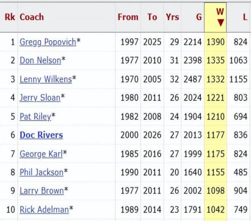 卡莱尔的生涯获胜场数依然是999胜,连续12场败北,让他继续无缘千胜里程碑。在NBA历史上,目前一共有10位教练取得至少1000场胜利,排在首位的是波波维奇(1390胜),现役主教练中,只有雄鹿的老里弗斯在列,他获得1177胜,在胜场排名中位列历史第6。