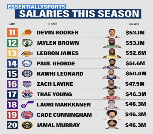 NBA本赛季球员年薪榜发布!库里第一4.12亿元!詹姆斯跌出前十